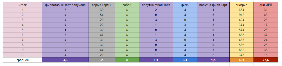 Из таблицы видно что статистику немного испортил игрок #4 который за 9 попыток поймал 4 фиолетовые карты. Но и такое тоже бывает. Поэтому оставляем его для статистики в таком виде.