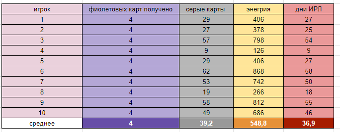 Давайте засимулируем процесс поиска 4х фиолетовых карт для 10 случайных игроков, и посмотрим на средние значения, чтобы сделать выводы.