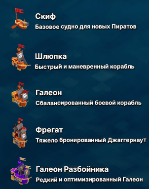Давайте освежим в памяти информацию о кораблях. как вы помните, на данный момент доступно 5 кораблей. Нас не интересует Скиф и Галеон разбойника, так как первый доступен в первые минуты игры, а последний не доступен вовсе обычным смертным.