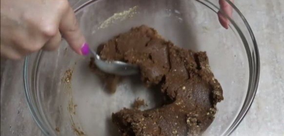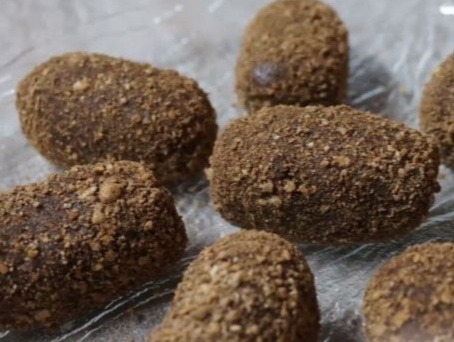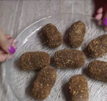 11. Из полученной массы формируем круглые или овальные пирожные. Обваливаем пирожные в смеси из одной столовой ложки какао и одной столовой ложки измельченного печенья.