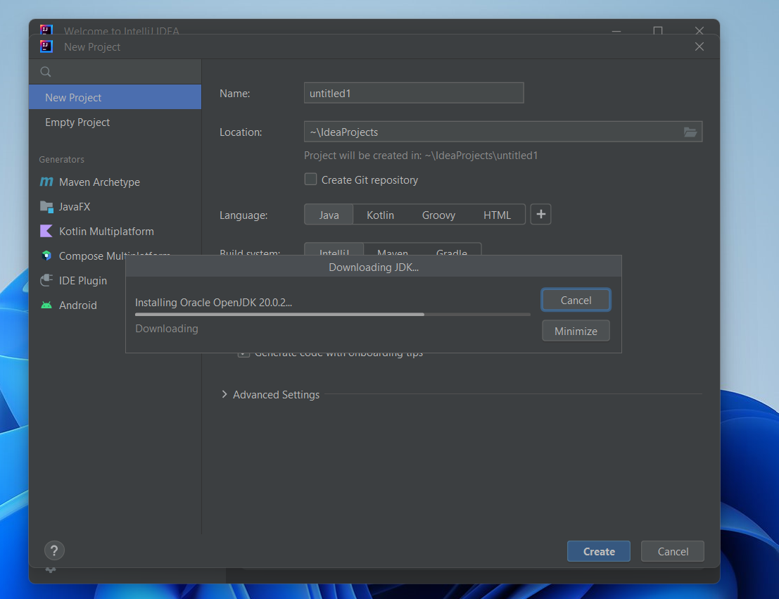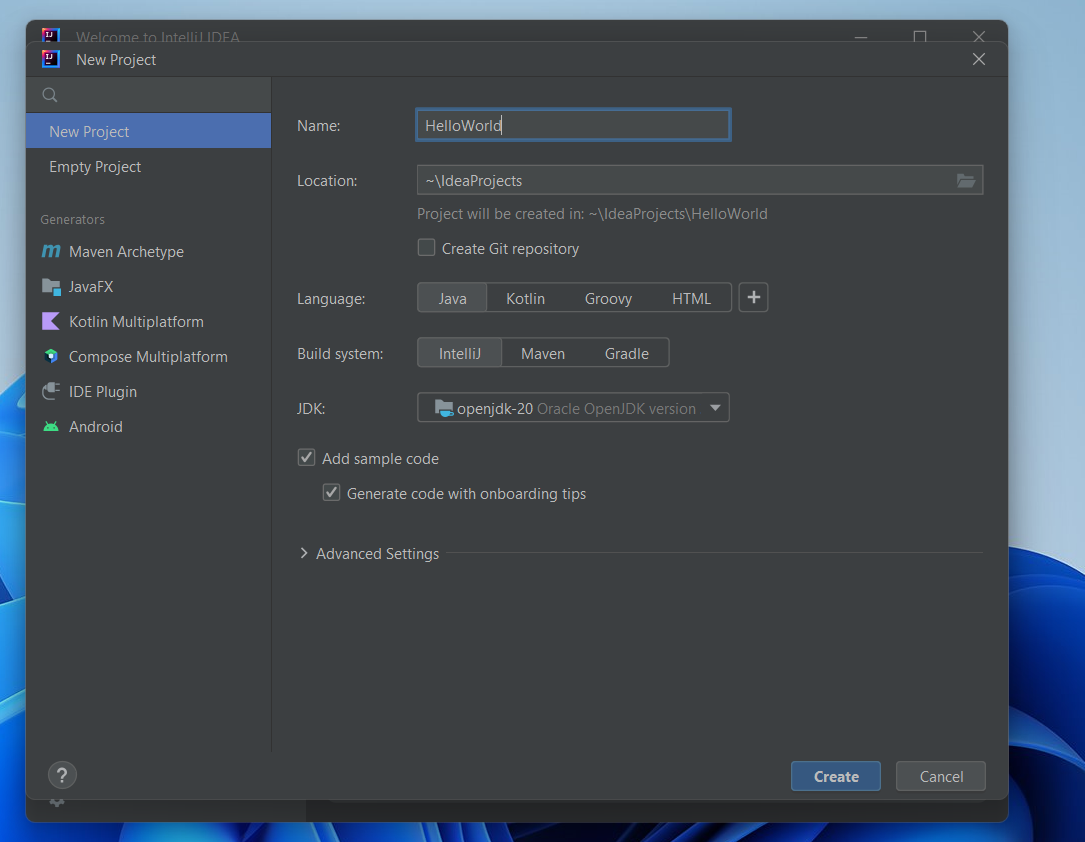 После скачивания JDK, укажем имя проекта. Поменяем его с untitled1 на HelloWorld и нажимаем Create.