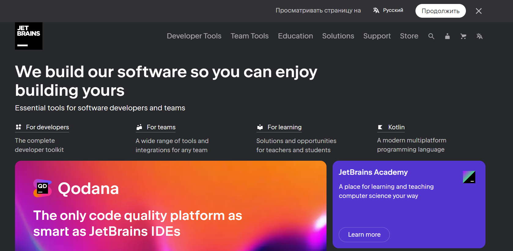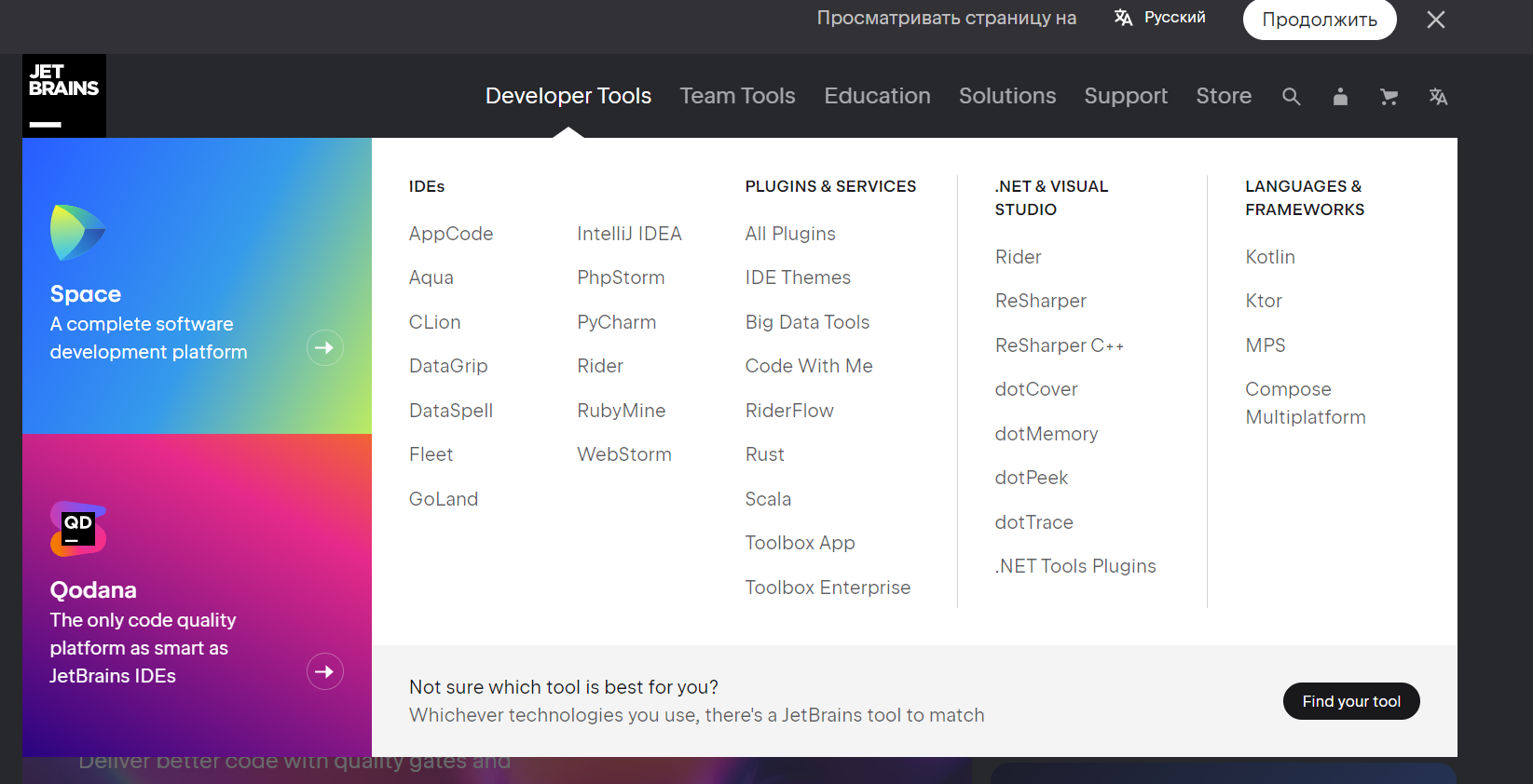 Заходим на сайт https://www.jetbrains.com/. Jetbrains это компания, которая делает тулы для разработчиков. В том числе всемирно изветсные среды для разработки, такие как IntelliJ IDEA для Java.