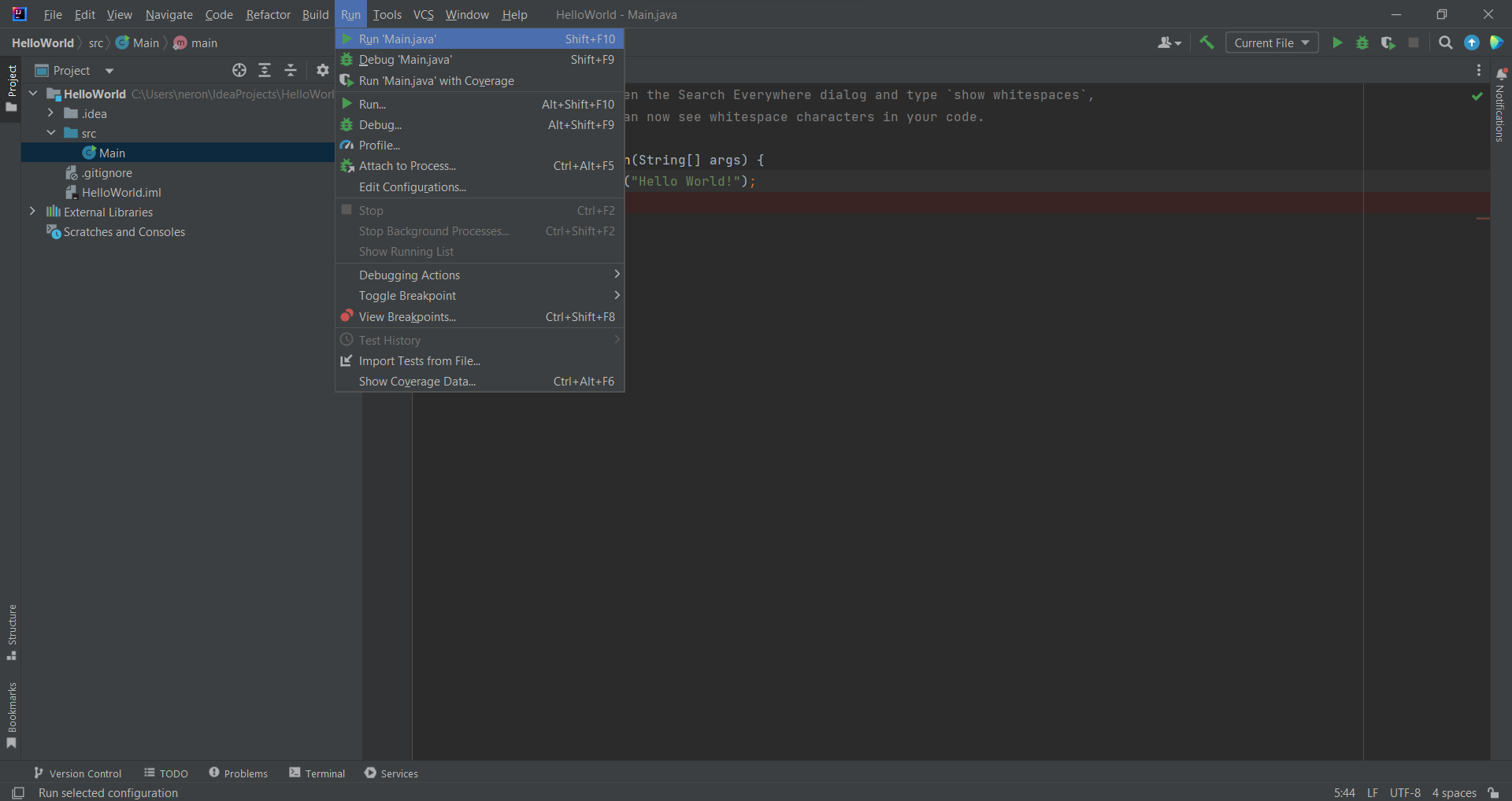 Перейдем в Run-> Run Main java для запуска программы.