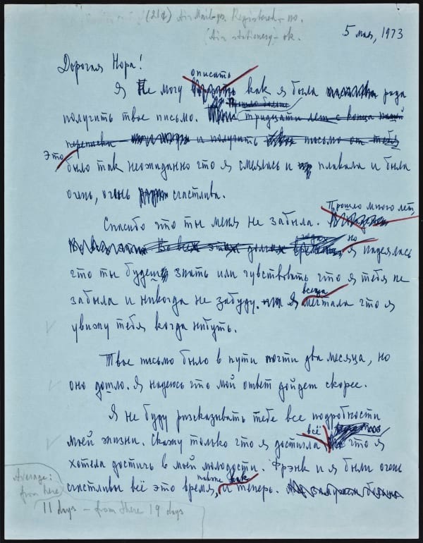 Дорогая, дорогая Норочка, я тебя очень люблю. Пожалуйста напиши мне подробно о себе. Как поживает твой муж Федя? Мне немножко трудно писать по-русски, так что извини меня пожалуйста если найдеш ошибки в этом письме. Я научусь писать правильнее.