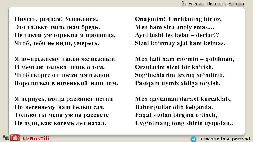 Перевод 🇺🇿🇺🇸🇷🇺 Таржима саньатиСергей Есенин.