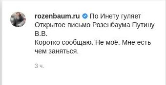 Опроверг свое авторство письма и сам Розенбаум . «По инету гуляет открытое письмо Розенбаума Путину В .В . . .