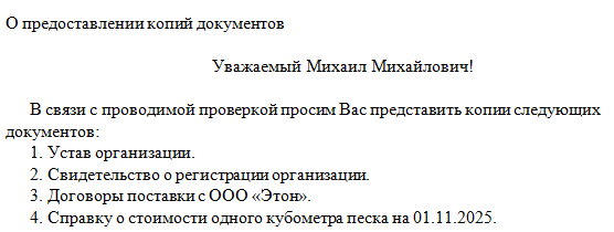Письмо о предоставлении товара