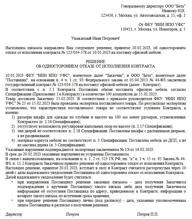 Письмо отказ от поставки