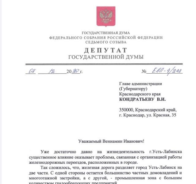 Письмо заместителя губернатора
