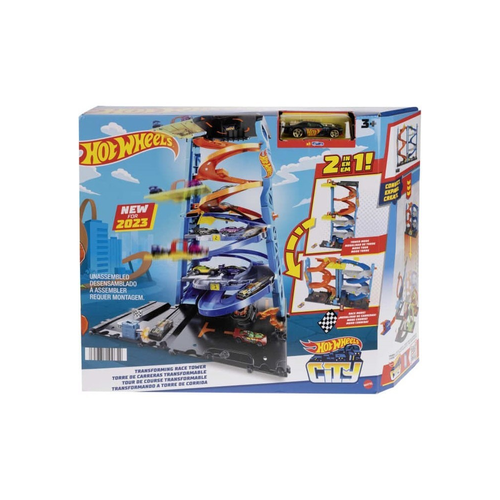 Participez à des courses épiques avec la Hot Wheels City Transforming Tower. Cet ensemble de jeu se transforme de deux pistes parallèles en une seule piste de plus de 64 cm de haut pour des courses encore plus imprévisibles et épiques !Participez à des courses épiques avec la Hot Wheels City Transforming Tower. Cet ensemble de jeu se transforme de deux pistes parallèles en une seule piste de plus de 64 cm de haut pour des courses encore plus imprévisibles et épiques !