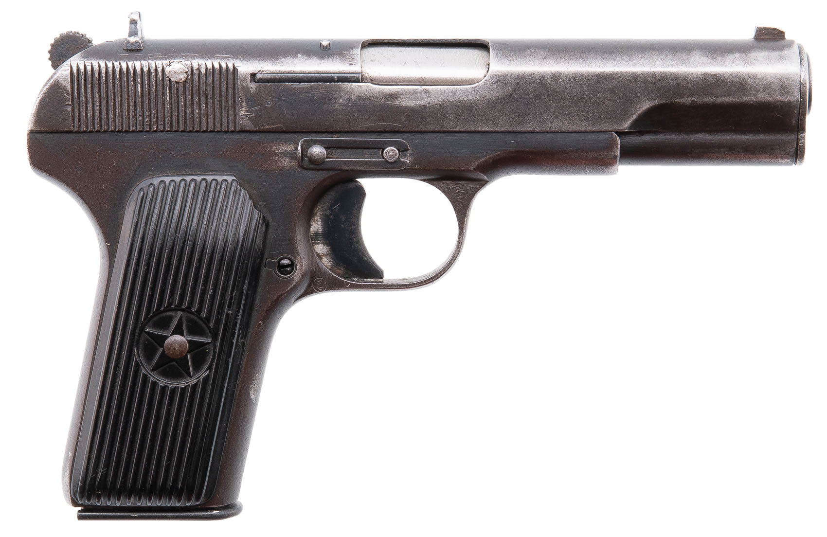 Пистолет Макарова . Один из первых серийных ПМ 1949 года выпуска, отличительными особенностями которого являются фигурные рамы, выступ с правой стороны спусковой скобы и магазины с косым выступом для выключения . . .