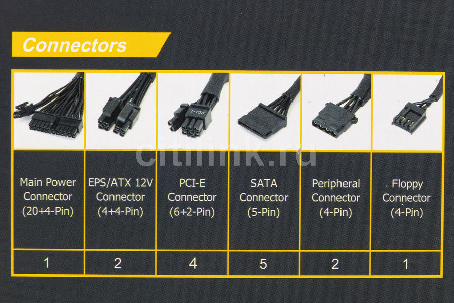 Питание материнской платы и процессора: 24+4+4 pin : Длина линий питания МП: 550 мм: Питание видеокарты: 4х(6+2) pin : Разъемы Peripheral (Molex) 4 шт: Разъемы SATA: 7 шт: Охлаждение; Размер вентилятора(ов) 120мм