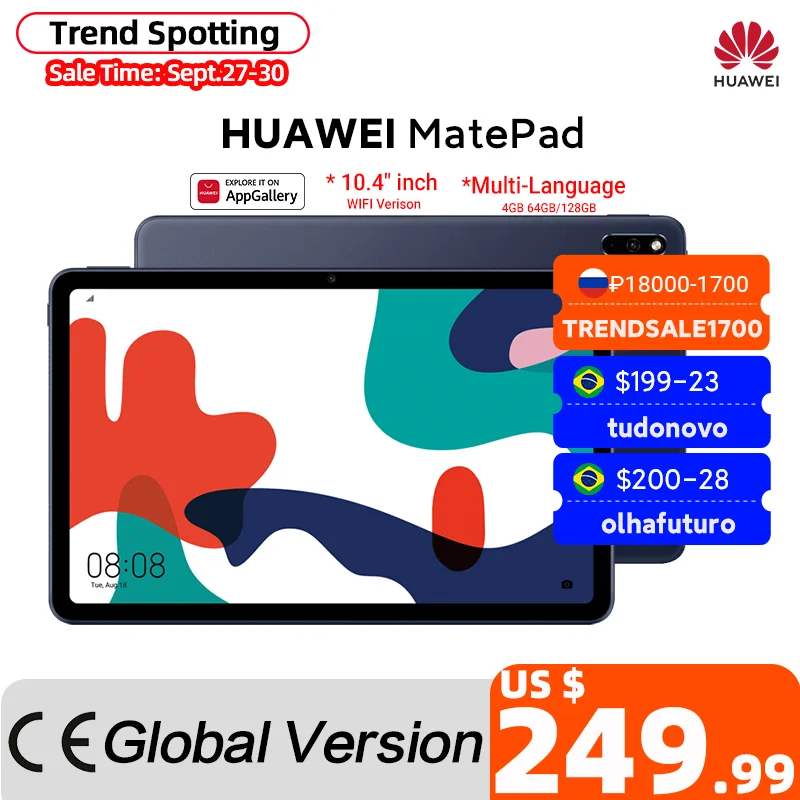 Huawei MatePad 10 .4 (WIFI) 4GB/ 128GB Huawei MatePad 10 .4 (WIFI) 4GB/ 128GB Display Size: 10 .4 inches Colour: 16 .7 million colours Type: IPS Touchscreen Brightness: 470 nit (Typical Value) Resolution: 2000 x 1200 Processor HUAWEI Kirin 810 CP