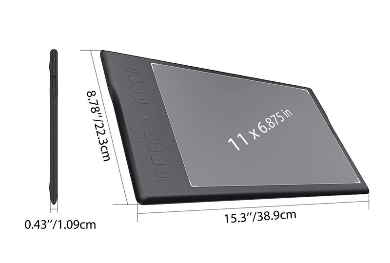 Inspiroy Q11K . Create without . interruption . A space friendly size, yet a large workspace . The tablet frame is narrowed down to bring you a larger workspace that boasts 11×6 .875inch, which enables your creative mind to wander as well as your hands to draw more freely .