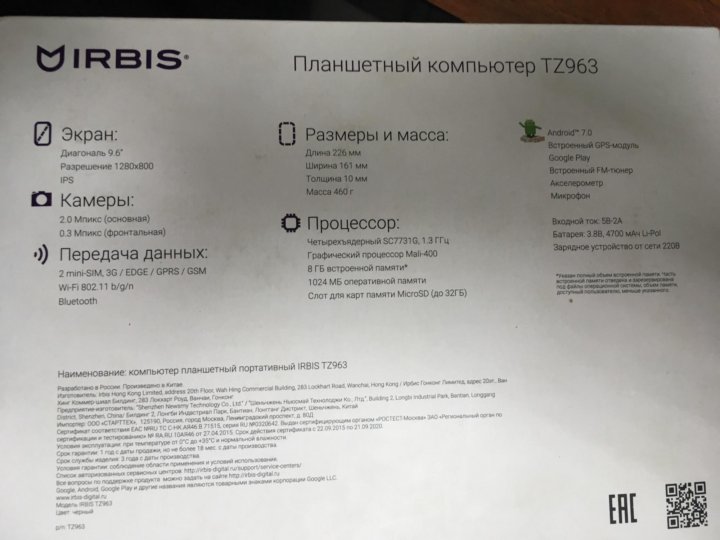 Планшет Irbis TZ963 (2017) 3 .9 . 5 отзывов . В избранное . Сравнить . Описание . Характеристики . Цены . Карта .