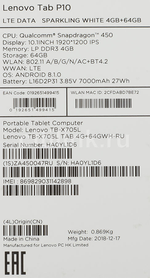 Lenovo Tab P10 TB- X705L : 4 GB RAM, 4 GB RAM, 64 GB max storage, Snapdragon 450 / Cortex-A53 chipset, 7000 mAh battery, 8 MP primary camera, 5 MP front camera, screen IPS 10 .1" 1920x1200, weight 440 g, Android, 3 .5mm Jack / USB Type-C, released on 11/2018