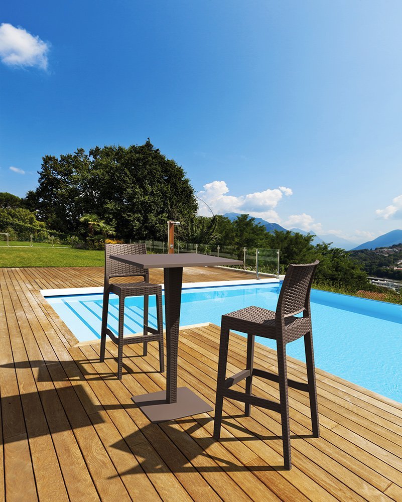 Стол на алюминиевых ножках, столешница пластиковая, кромка иммитация ротанга, цвет оранжевый, зеленый, черный, белый, серый, бежевый.