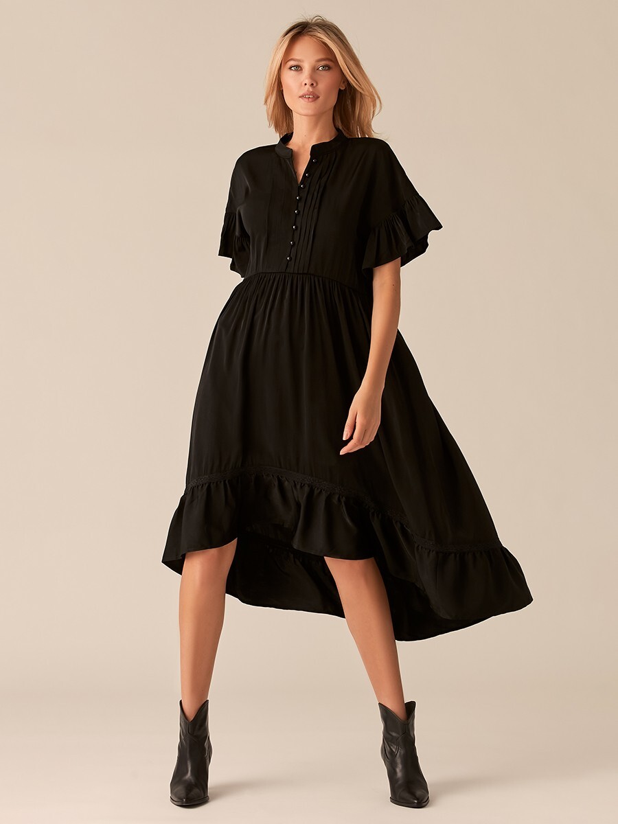 Платье полуприлегающего силуэта, со спущенными рукавами, длиной ниже линии колена, внизу боковых шво..