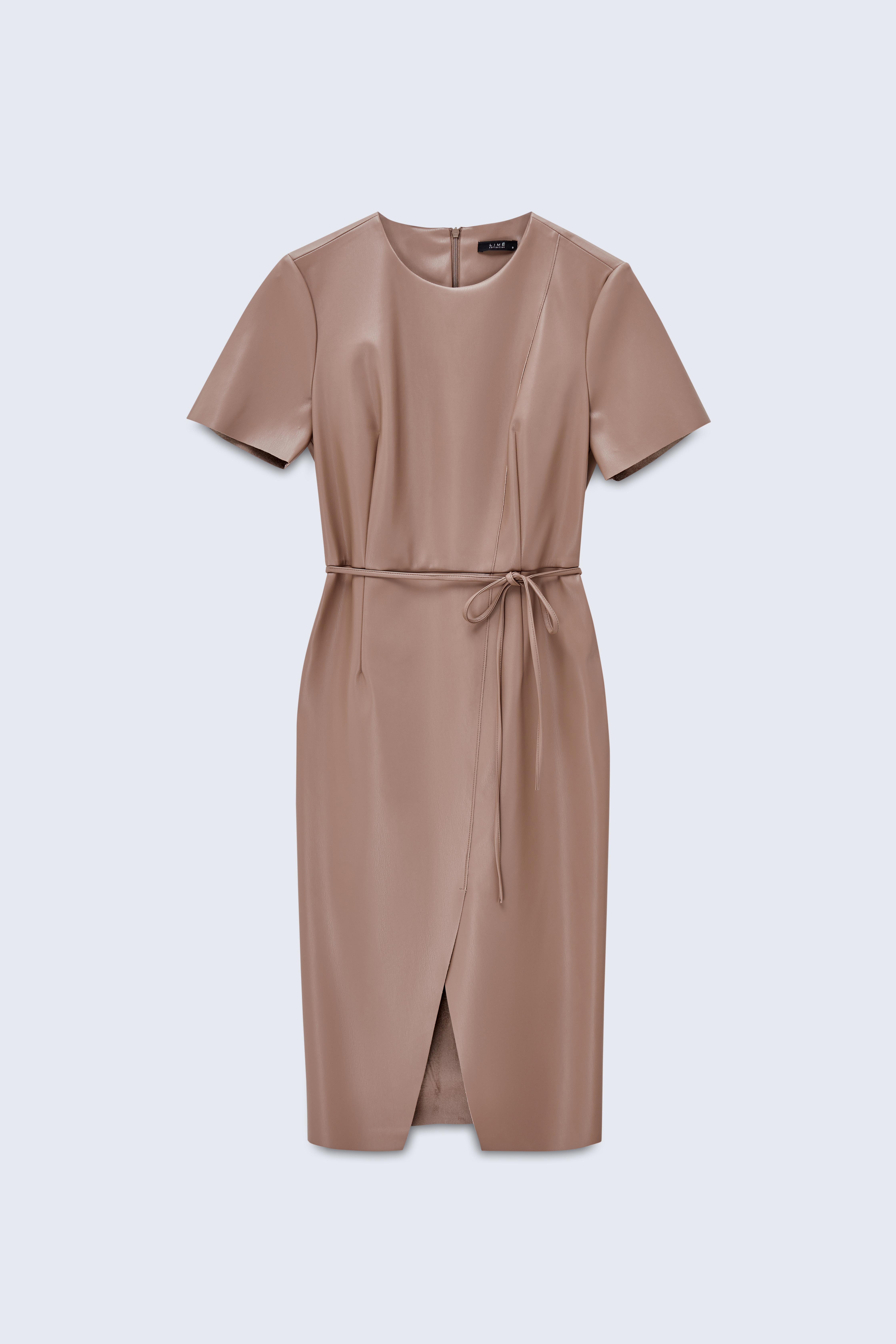 Бежевое кожаное платье футляр