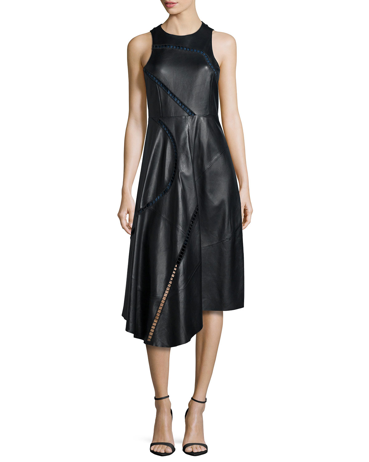 Короткое облегающее платье из плотного рельефного трикотажа с небольшим вырезом сердечком и двойными узкими бретелями, короткий разрез с одной стороны.