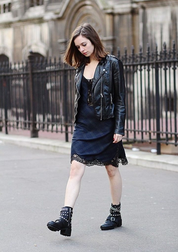 Платье-комбинация розового оттенка, украшенное черными кружевными вставками в нижней и верхней частях, будет прекрасно смотреться в образе, если сочетать его с черной косухой. В качестве украшений можно надеть черные серьги-кисточки.