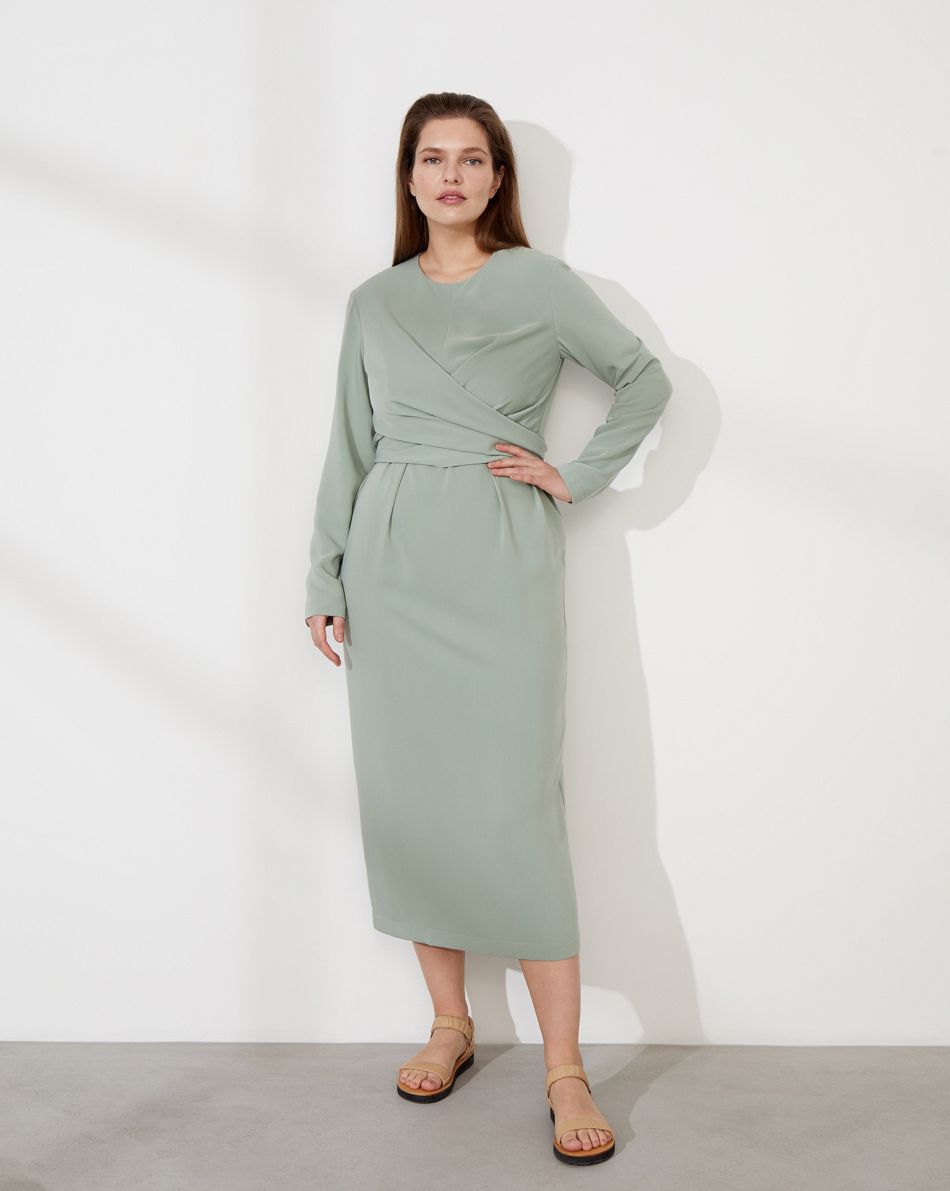 Платье с завязками на талии. Закрытые линии и приталенный силуэт платья миди создают спокойный, но притягательный образ. При соприкосновении с шершавыми предметами на ткани могут появиться затяжки. Требует бережного ухода.