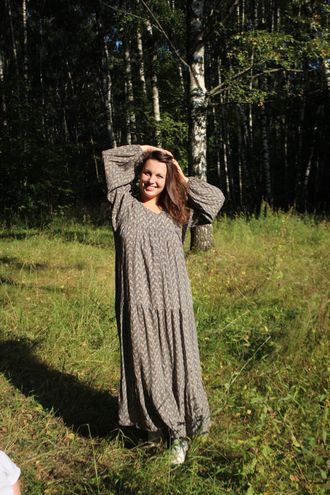 Платье из штапеля с лайкрой. Перед и спинка крой по косой- что придает красивое облегание фигуры. Перед- застежка на пуговицах. Юбка трех ярусная , которая начинается ниже талии на 10см. Обработка внутри чистая- сделана закрытым швом. Рукава 3/4
