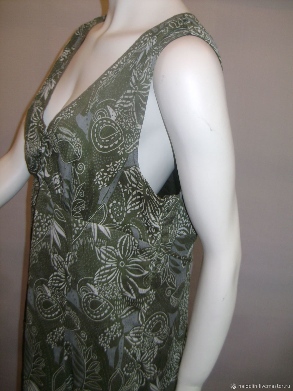 Платье прямого силуэта из района. Длина миди. Застежка на молнии на спинке. Спущенные плечи. Круглый..