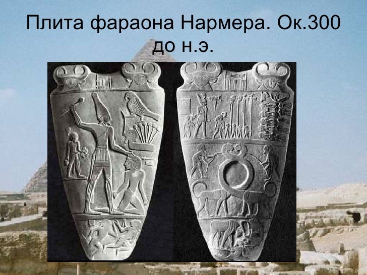 Палетка фараона Нармера . Каирский музей Палетка Нармера — алевролитовая пластина культового . . .Один из самых древних египетских рельефов — шиферная палетка* фараона Нармера (восходящая . . .Изображение на одной стороне плиты расшифровывается, как фраза . . .