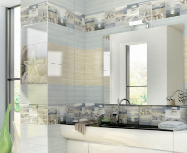 Оригинальный дизайн керамической плитки Дель Маре создающий наполненный атмосферой спокойствия и отдыха в бежево-коричневых тонах с голубыми вставками, не оставит равнодушным самый критический взгляд .