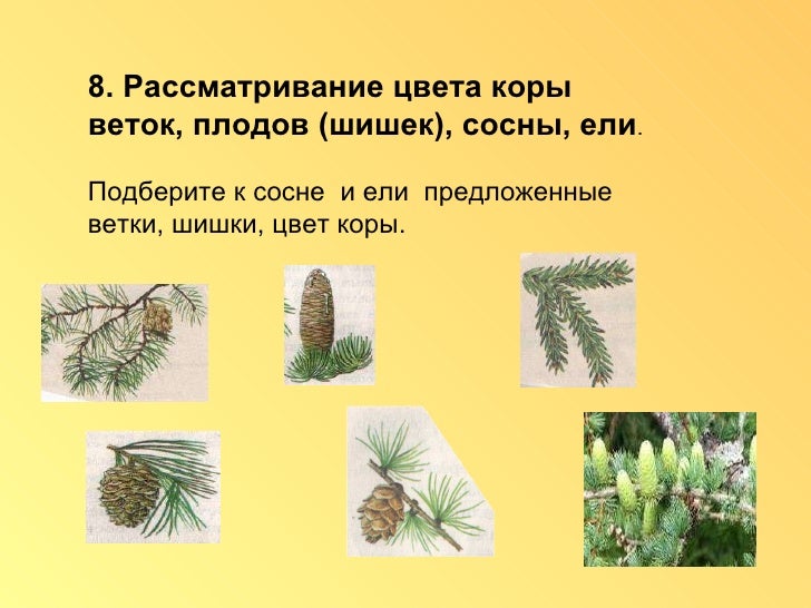Шишки это плоды ели . Они сначала светло - зленные, а когда созревают, становятся бурые . Место, где растут одни ели, называют еловый лес или ельник» (звучит магнитофонная запись)