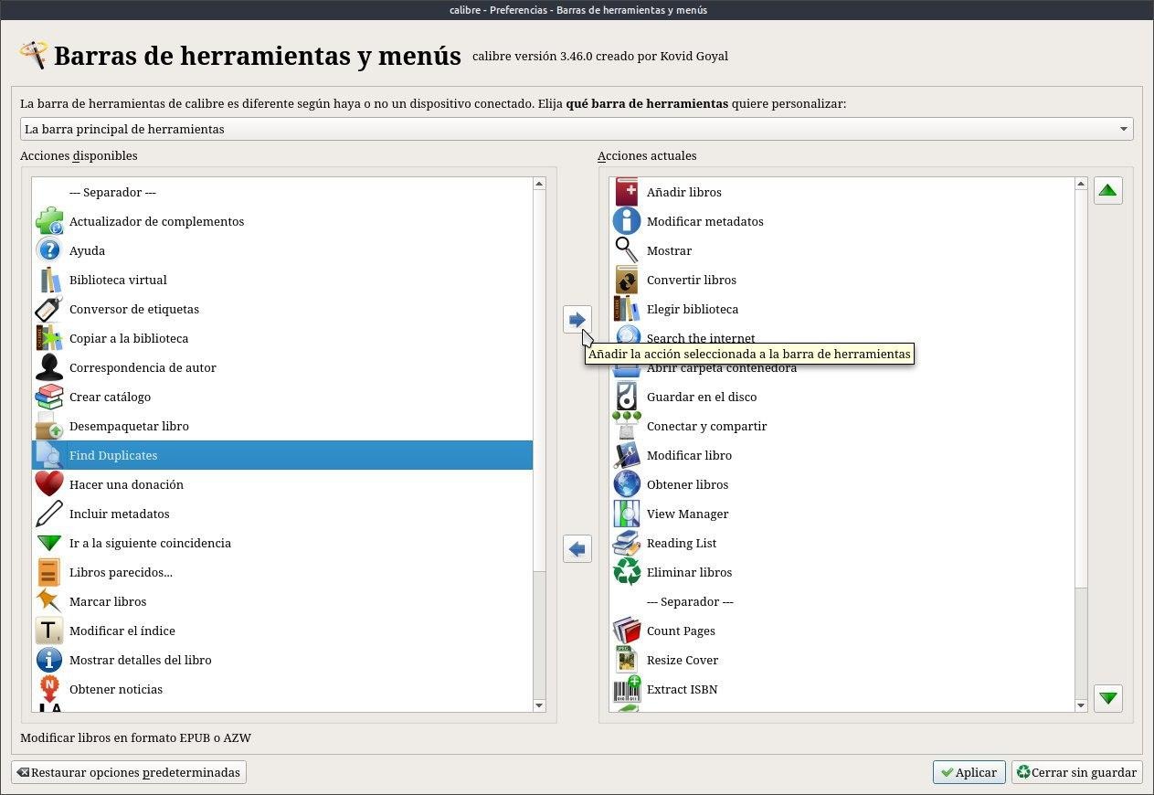 A la izquierda esta el plugin, lo tenemos que pasar a la derecha con la flechita azul y tocar aplicar, reiniciamos Calibre.