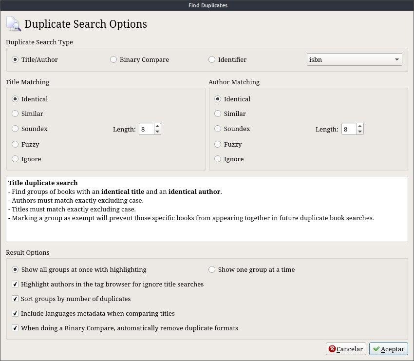WalterUna vez que nuestra biblioteca va creciendo y en la ansiedad de seguir juntando libros, como sabemos si no tenemos el libro repetido??? Si bien Calibre nos informa si hay un duplicado, aveces puede pasar que el archivo del libro este escrito de diferente manera al que tenemos, Y para eso...