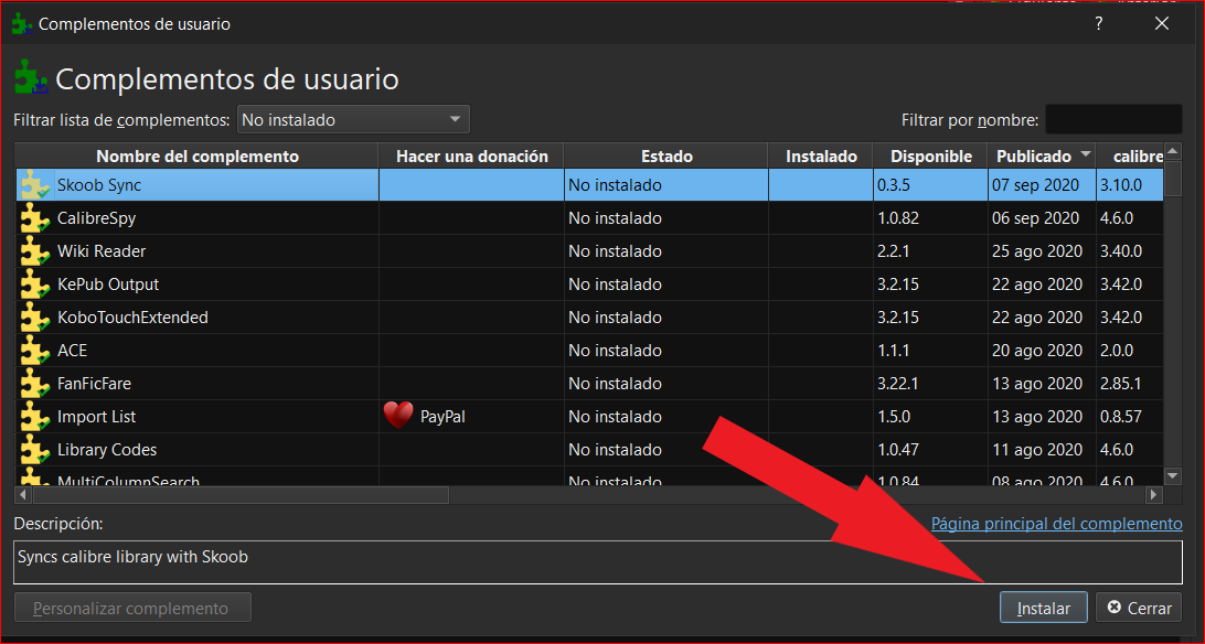 Seleccionamos el complemento que quisiéramos y tocamos instalar.