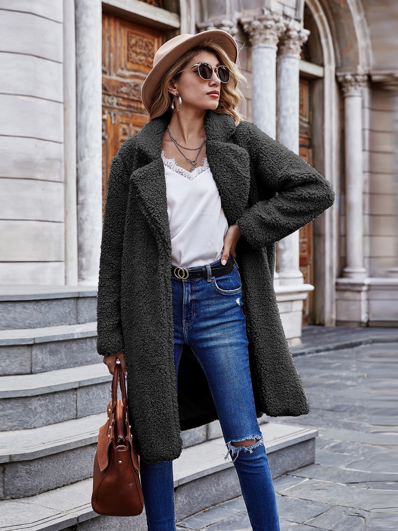 Серое Пальто Бежевая Сумка