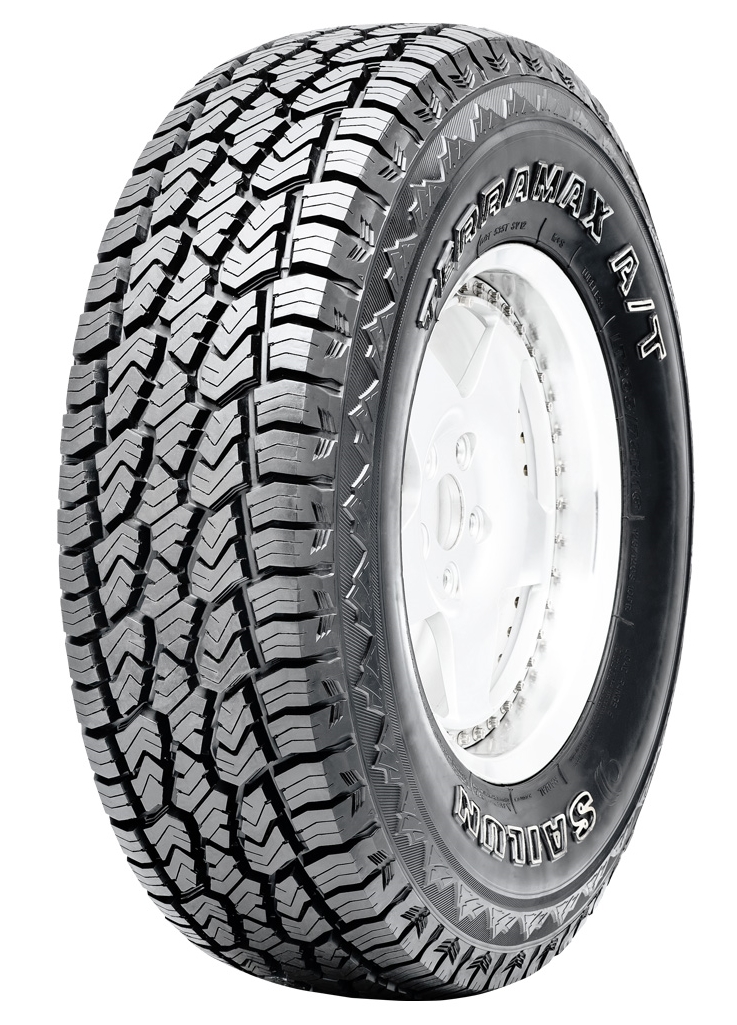 Pneus tout-terrain Sailun Terramax A/T SUV Les pneus tout-terrain Sailun Terramax A/T SUV ont un design agressif, une construction durable et une réserve de marche accrue, ce qui les rend populaires parmi les automobilistes. Les pneus conviennent à la plupart des SUV, camionnettes et jeeps. Grâce à la conception de la bande de roulement en blocs, ils peuvent être utilisés aussi bien sur des surfaces permanentes que sur des terrains accidentés. Le marquage A/T signifie All Terrain et indique le principal avantage des pneus Sailun Terramax A/T SUV : leur polyvalence et leur flexibilité d'utilisation. Sculpture de la bande de roulement Dans la zone de contact se trouvent cinq rangées de blocs de caoutchouc à angles aigus, abondamment recouverts de lamelles. Ils créent des centaines d'arêtes de coupe qui adhèrent aux surfaces instables et assurent un contact fiable avec les routes mouillées et les chemins de terre. La disposition multidirectionnelle des lamelles permet d'obtenir des propriétés d'adhérence optimales dans tous les modes de conduite : conduite en ligne droite, déplacement le long d'un anneau, manœuvres, etc. Une partie importante de la surface de roulement est occupée par des rainures d'évacuation de l'eau et des saletés situées entre les blocs. Ils ont une caractéristique remarquable : des parois latérales inclinées. Grâce à leur légère inclinaison, les rainures de la bande de roulement sont mieux débarrassées de la saleté et des petits cailloux. Les blocs costaux huméraux sont regroupés par deux. En raison de leur double structure, ils ont une rigidité accrue et, par conséquent, se déforment moins sous les charges longitudinales et latérales. En raison de la mobilité limitée des blocs d'épaulement, les pneus offrent une maniabilité précise et répondent instantanément aux commandes de direction. Carcasse en fibre d'aramide Pour donner aux pneus Terramax A/T SUV la résistance nécessaire, les développeurs ont utilisé des fils d'aramide dans leur structure interne. Ce matériau est conçu pour renforcer les pneus, augmentant ainsi leur rigidité et leur résistance aux chocs. Grâce à la structure renforcée, les pneus deviennent plus adaptés aux conditions de fonctionnement difficiles, par exemple lors des déplacements sur des routes forestières et de montagne. Les cadres en aramide les protègent de manière fiable contre les chocs et les déchirures au contact d'objets durs et pointus : broussailles sèches, pierres pointues, nids-de-poule sur la route, morceaux d'asphalte cassés.