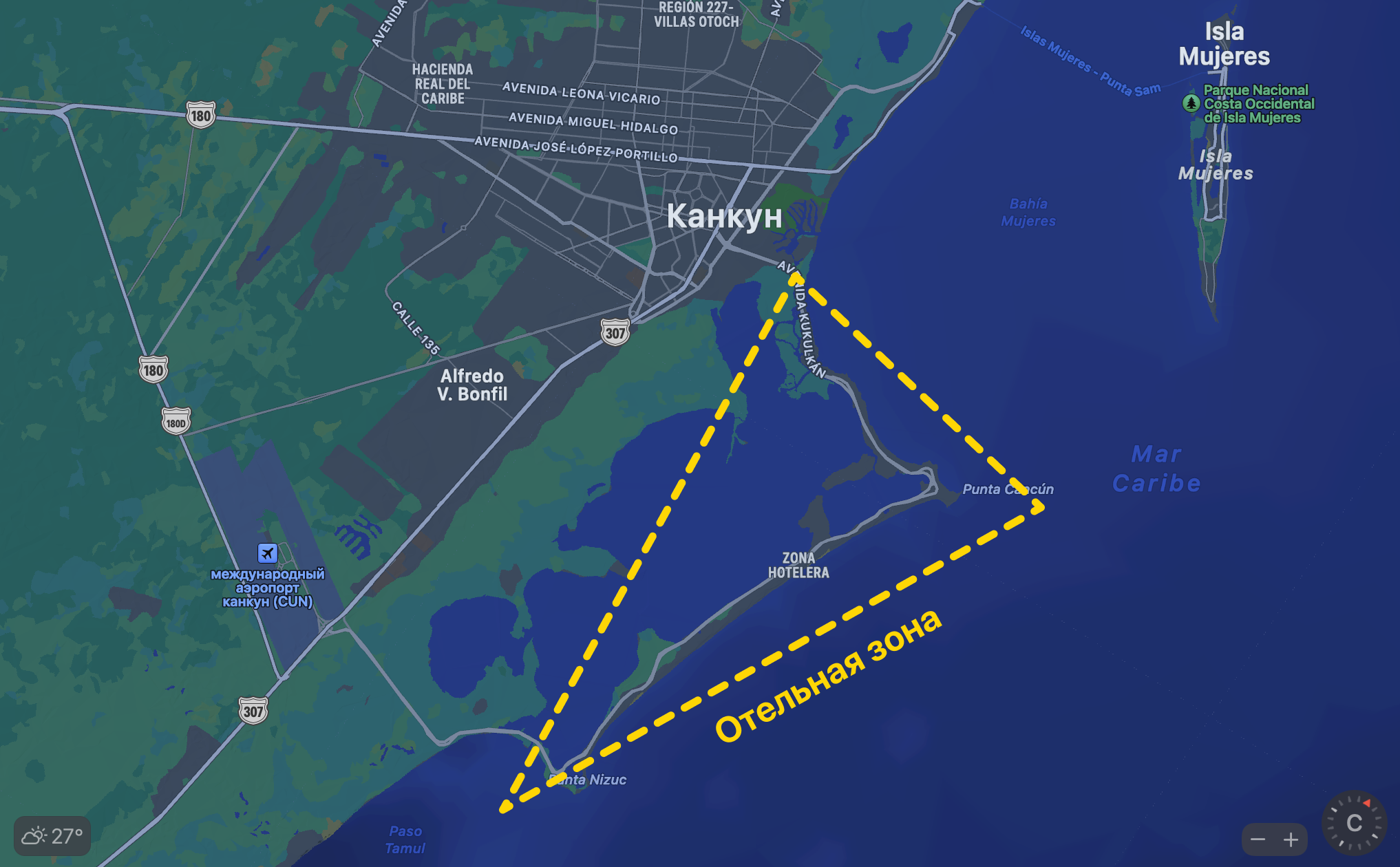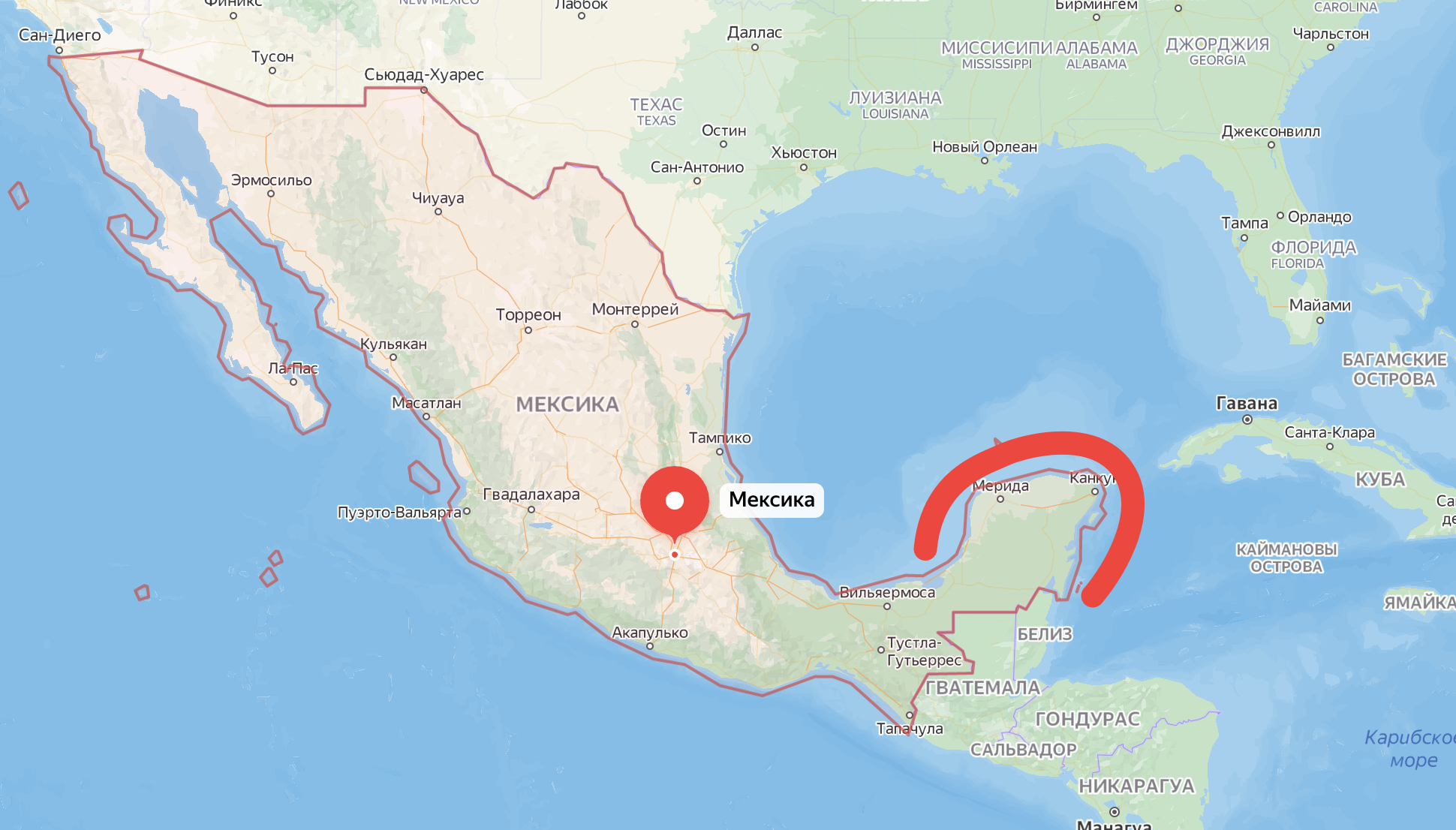 Вот этот красный кончик — пляжно-туристическая часть Мексики. Сюда любят приезжать американские пенсионеры почиллить в отелях. Для них это также, как для русских сгонять по путевке в Турцию. На самом кончике этого кончика находится Канкун, самый обычный город с аэропортом.
