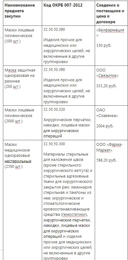 Кроме этого, были выбраны коды ОКРБ 007-2012, которые не соответствовали закупаемому товару. Например, наименование предмета закупки указано «Маски медицинские одноразовые нестерильные», однако код при этом выбран 32.50.50.300 - «Материалы стерильные для наложения швов (кроме стерильного хирургического кетгута) и стерильные адгезивные ткани для хирургического закрытия ран; ламинария стерильная и тампоны из нее; хирургические и стоматологические кровоостанавливающие средства (гемостатики), хирургические перчатки, накидки, лицевые маски для хирургических операций и изделия прочие для медицинских или хирургических целей, не включенные в другие группировки».