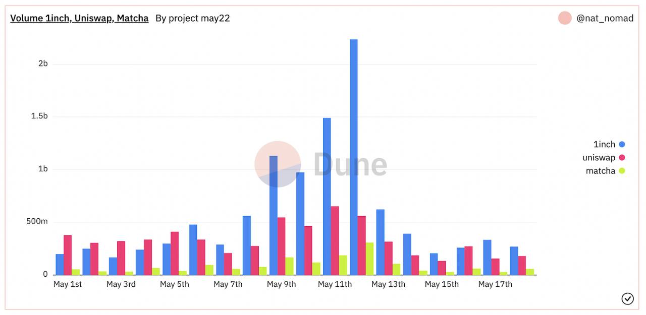 На сегодняшний день 1inch стал №1 на рынке DEX, обогнав своего давнего конкурента лауреата Uniswap. Сейчас дневной объем торгов на 1inch более 2,2 миллиардов долларов, что более чем в 3 раза выше чем на Uniswap.