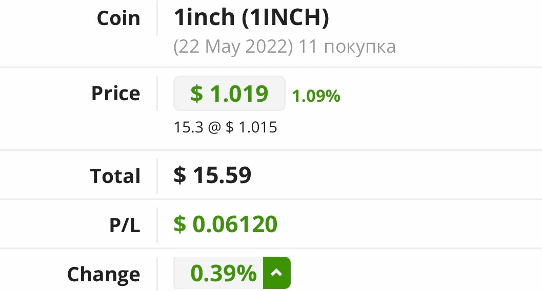 на них я приобрела 15,3 монет 1INCH (по курсу 1INCH/USDT 1,015$)