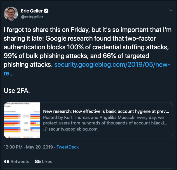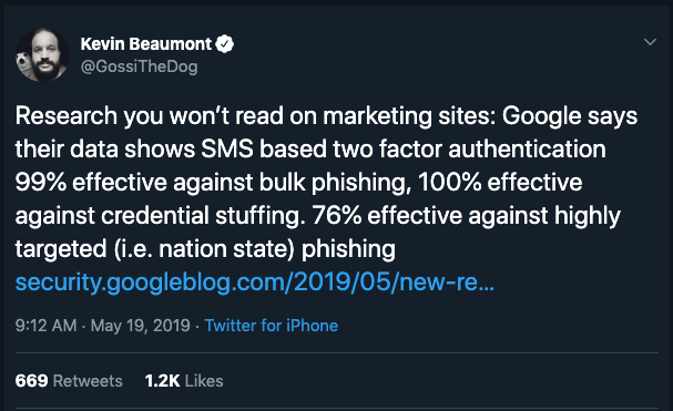 В блоге Google Security есть отличная публикация под названием "How effective is basic account hygiene at preventing hijacking" или "На сколько эффективна базовая гигиена аккаунта для предотвращения его угона". В этой статье речь идет о двухфакторной аутентификации и ее эффективности при использовании в корпорации. К сожалению, повествование в ней ведется таким образом, что у обывателя может возникнуть мнение, что некоторые распостраненные формы 2FA останавливают 100% всех атак.