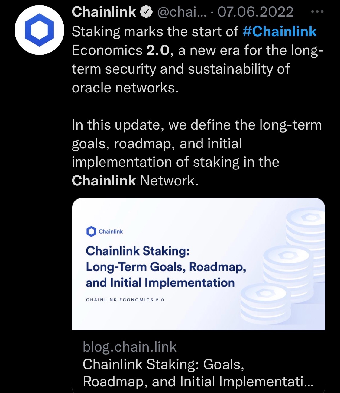 «Стейкинг знаменует собой начало #Chainlink Economics 2.0, новой эры долгосрочной безопасности и устойчивости сетей оракулов.
