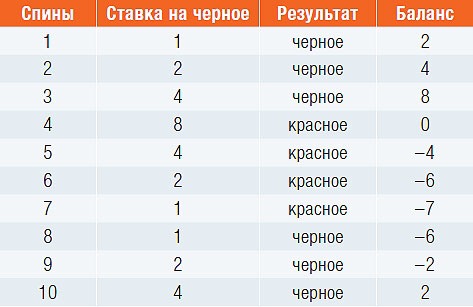 Схема кажется логичной, но в действительности суммарный выигрыш не превысит размера изначальной ставки. Пусть игрок ставит на черное и угадывает на шестом обороте (игроки говорят — спине). Тогда его баланс выглядит так: