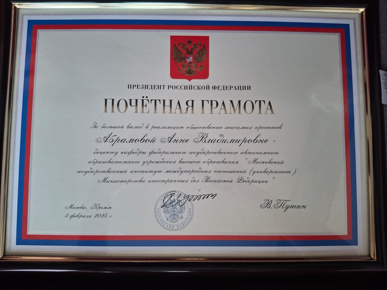 Почетная Грамота Президента Рф Фото
