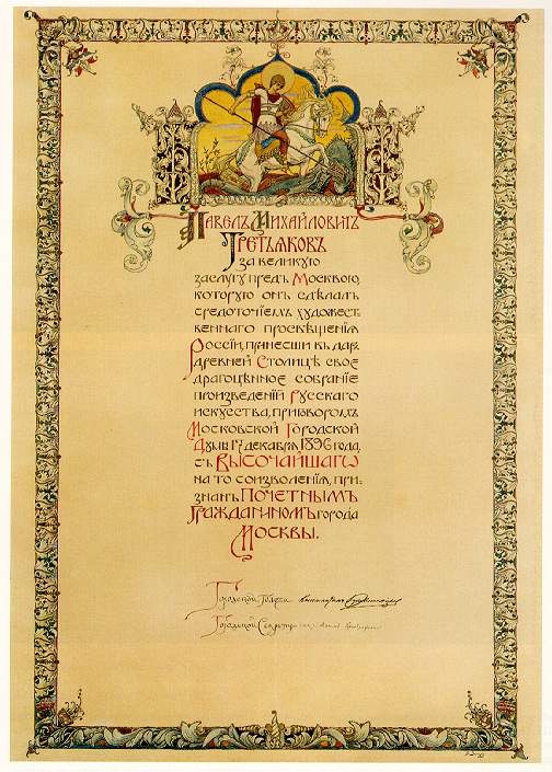 Грамоту о присвоении в 1896г. П. М. Третьякову звания почётного гражданина раскрасил В. М. Васнецов.