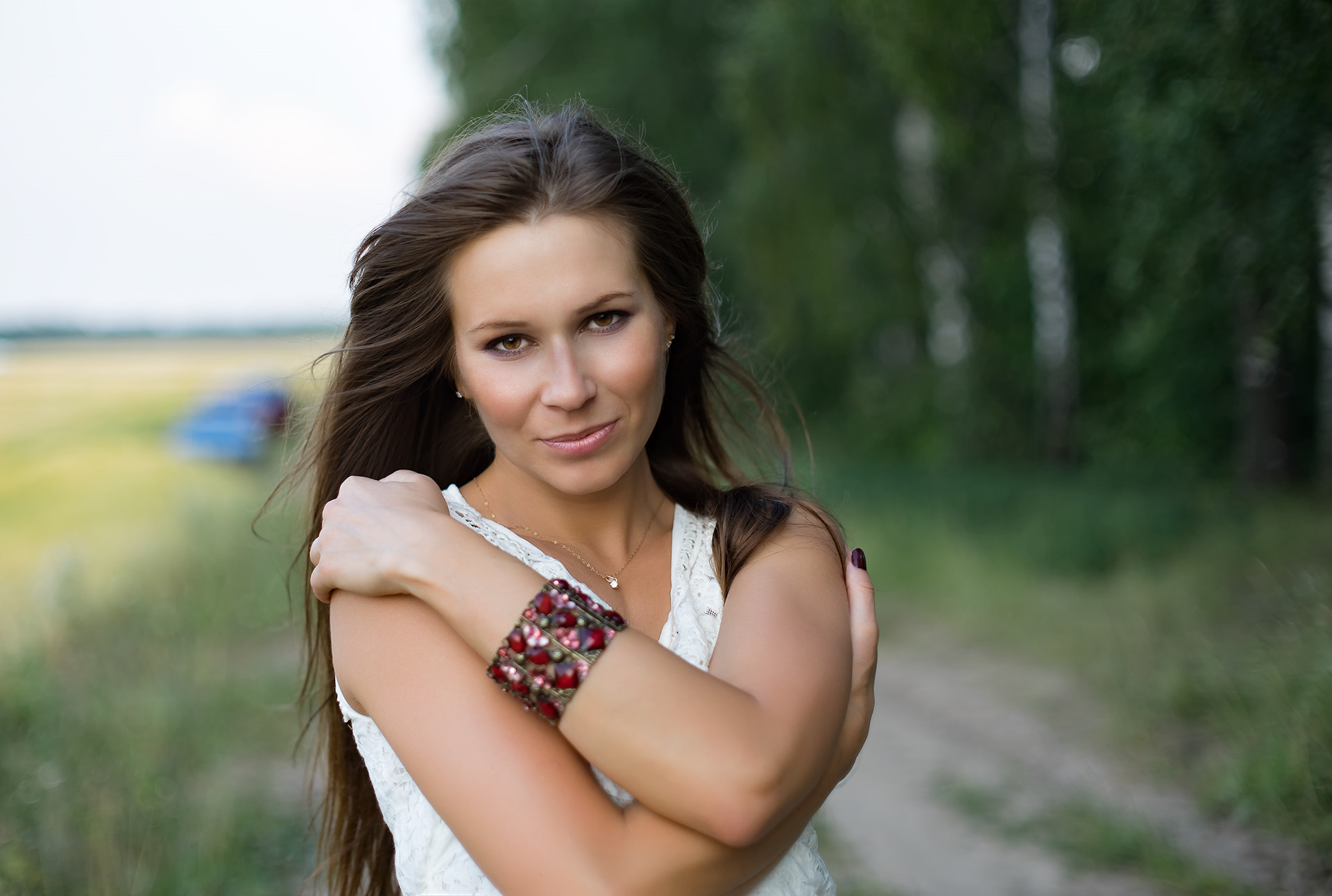 Очень Милая Девушка Раздевается У Зеленых Деревьев