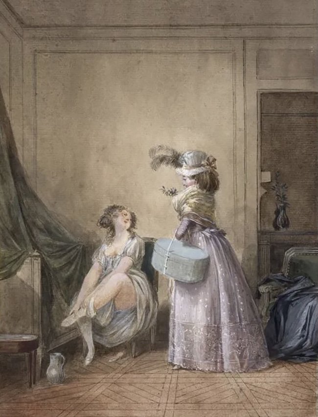 Если вы хотели обзавестись платьем, сначала нужно было побывать и у торговца тканями. Затем - у портного, или у портного и портнихи (да-да, была разница!). Те могли шить, но не имели права отделывать наряды. И вот как раз отделка оставалась за модистками.