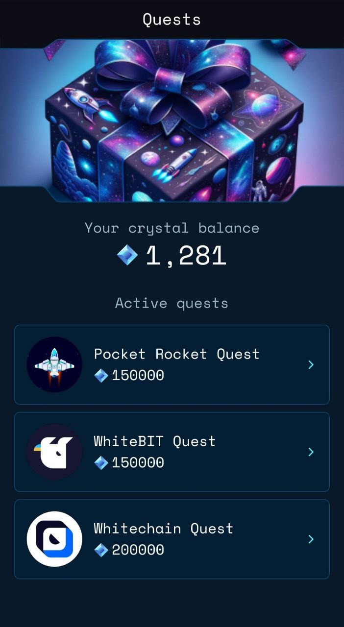 Pocket Rocket is a web3 space game for the Whitechain community. It a strategy where players compete for mining crystal rocks, upgrade spaceships and destroy asteroids. Tap on the screen to launch rocket and explore new galaxies🚀