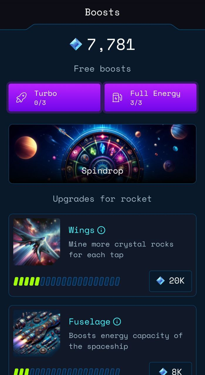 It’s very simple. Go to the ‘Boosts’ section and select different upgrades for your rocket to maximize its mining performance🚀