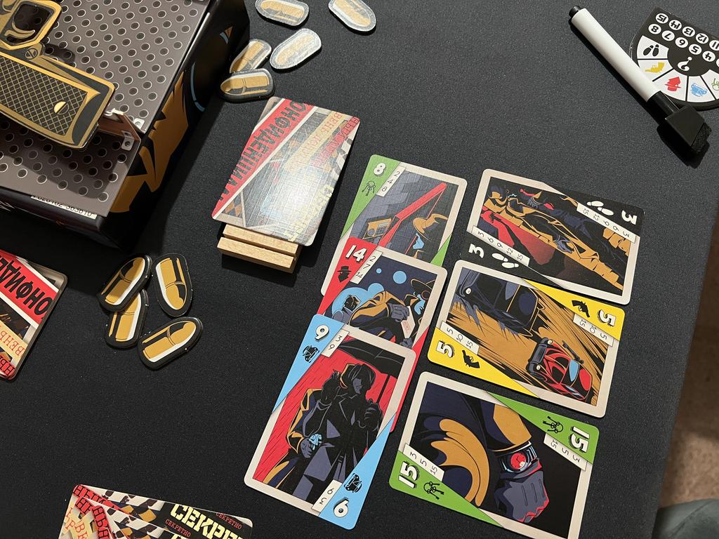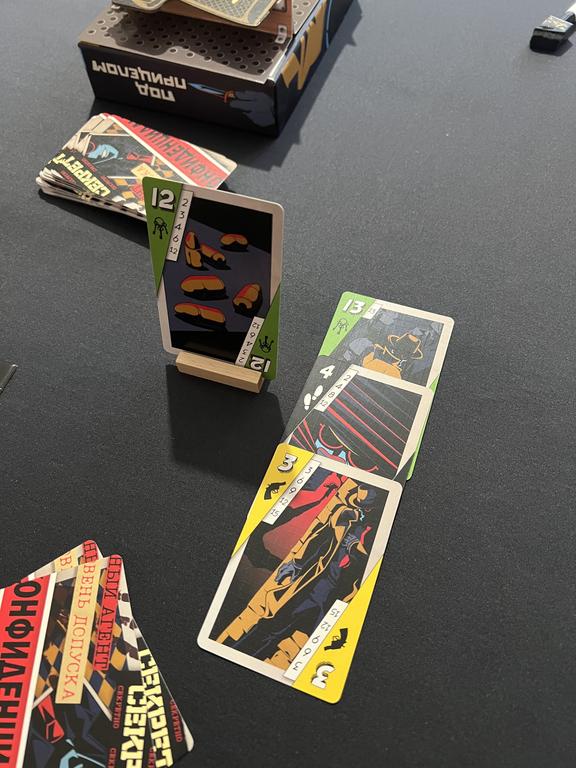 Традиционно начнём с оформления. Мне оно нравится. Эдакий своеобразный нуар про шпионов. Увы, разные рисунки только на разных номиналах, а среди мастей арты точно такие же. Но это свойственно всем подобным трикоподобным играм: хоть Экипаж, хоть Джекил и Хайд против Скотланд Ярда. Норм, достаточно.
